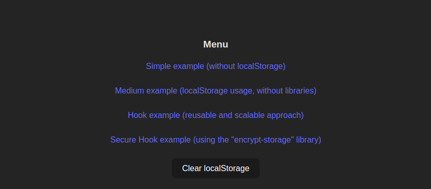 So, we have a notion of how to interact with localStorage. Now, we will use it as the React Hook Style 😎. The following code examples are available in the react-localstorage-example repository.